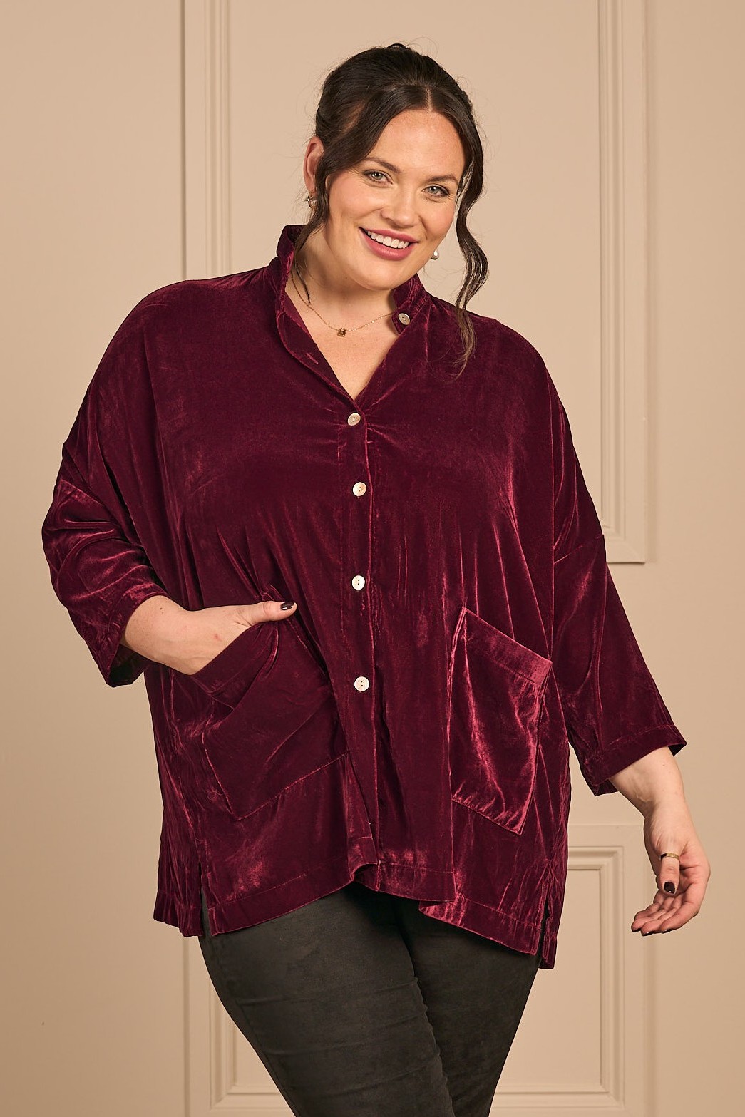 This fabulous velvet jacket is one size, so it will hang beautifully on everyone within our Froxx size range.  Our model is size 18-20 and 5’9″ tall