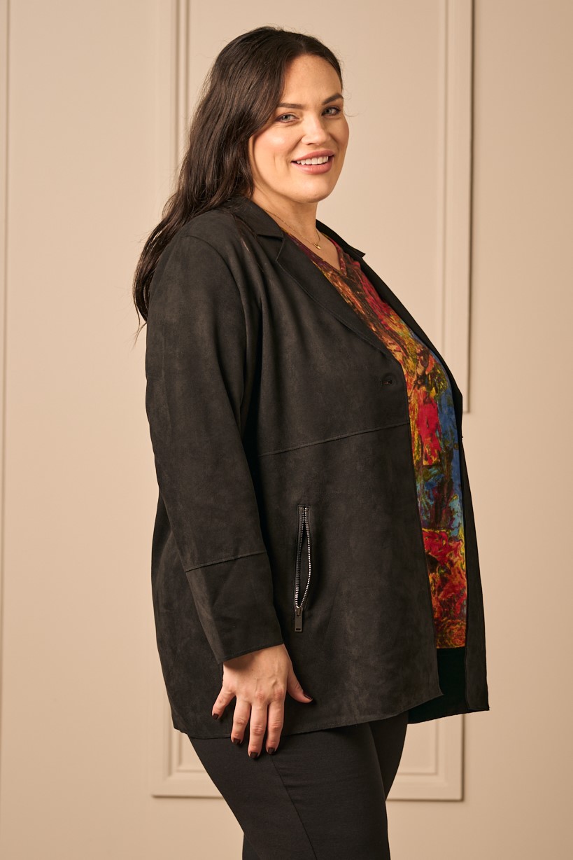 Wow! What a jacket. Available in 3 colours, this beautifully soft faux suede fabric hangs really softly, but is also classically tailored for a perfect fit. It features a classic collar with reveres down to a single button fastening, and zip pockets on the front. It’s a perfect weight for evenings this summer, or every day for Autumn.