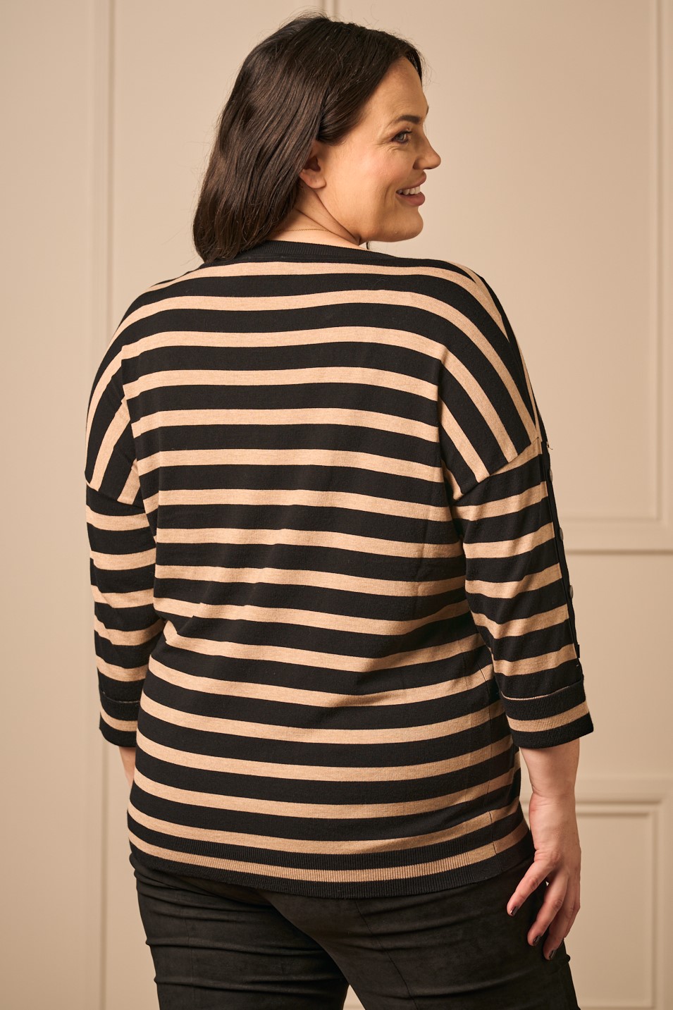 A fabulously soft jumper in a classic black/sand stripe.  It features a soft round neckline, dolman 3/4 sleeves with a button feature which leads down to a turn back cuff.  It looks fabulous worn with one of the Via Appia faux suede jackets – a complete outfit to take you from Autumn to Spring!